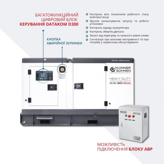 Цифровий контролер Datakom D300 відображає в реальному часі напругу, струм, частоту, рівень палива, оливи та температуру. При підключенні сумісного блоку АВР станція самостійно запускається та приймає навантаження за лічені секунди після зникнення мережевого живлення.