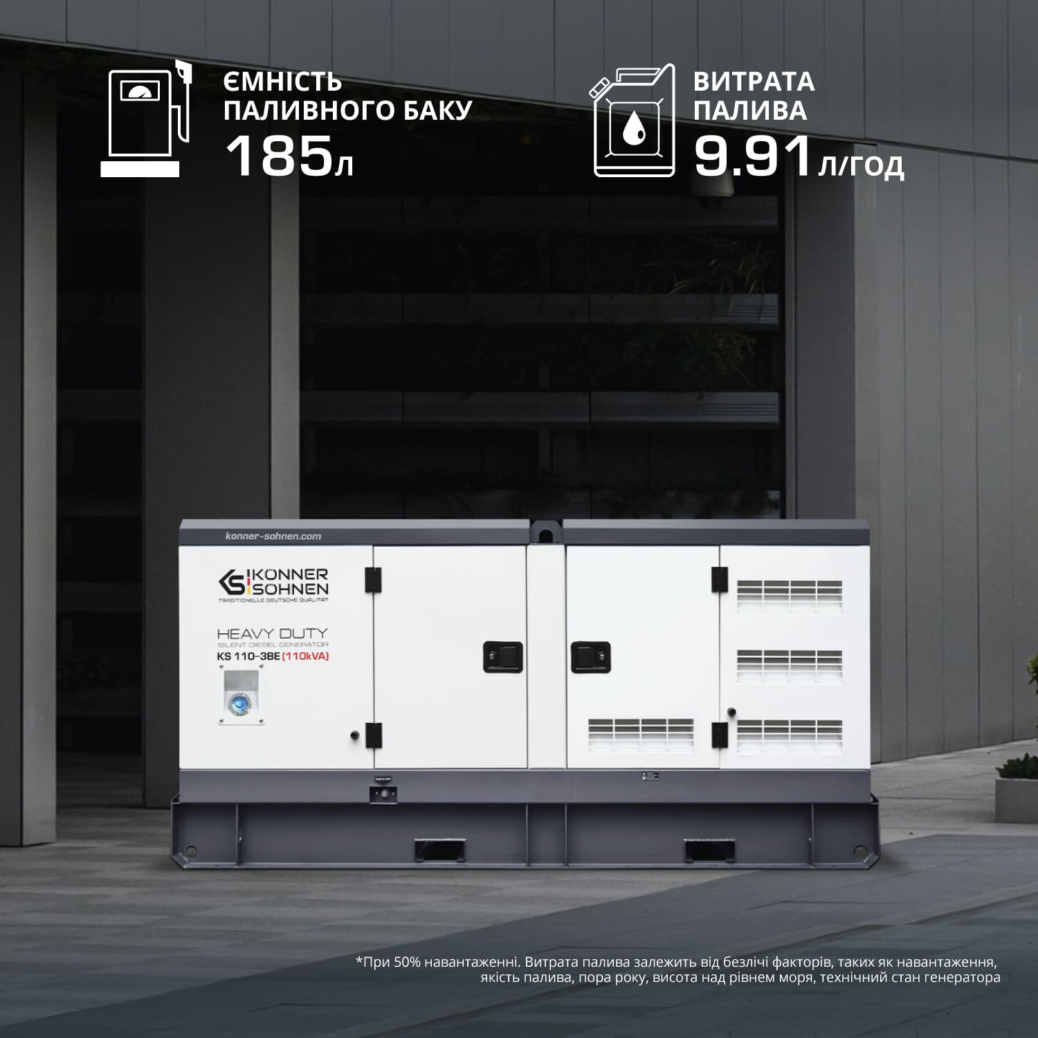 Könner & Söhnen KS 110-3BE є стаціонарним дизельним генератором для об’єктів із високими вимогами до надійності та потужності. Поєднання двигуна Baudouin, цифрового керування та захищеного корпусу формує збалансоване рішення для тривалої експлуатації.