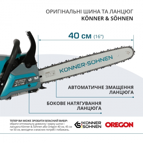 Konner & Sohnen KS CS31G-16 поєднує потужний двигун, продуману пильну систему та комплекс захисних рішень. Модель підходить для регулярних робіт із деревиною, де важливі автономність, контроль і стабільна механіка.