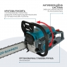 Система безпеки включає інерційне гальмо ланцюга, уловлювач ланцюга, зубчастий упор і блокування курка дросельної заслінки. Антивібраційна система та прогумовані рукоятки знижують навантаження на руки й покращують контроль інструмента.