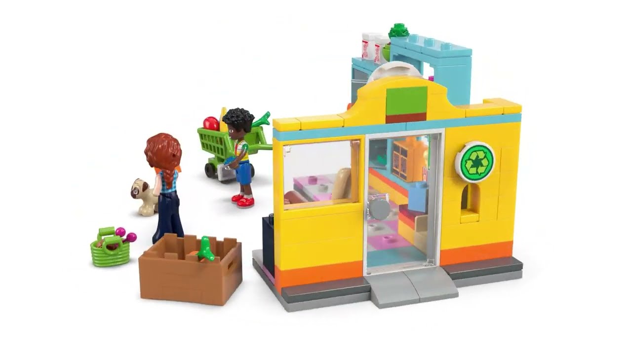 Набір LEGO Friends Цілодобовий магазин у Хартлейк-Сіті (42680) відтворює типову крамницю з полицями, заповненими продуктами, візком для покупок, кошиком та касовим апаратом. У центрі — пункт приймання вторсировини, що додає екологічний елемент до ігор. Мініляльки Отом і Зак можуть виконувати ролі покупця та продавця, а іграшкова собака додає живості сценам.