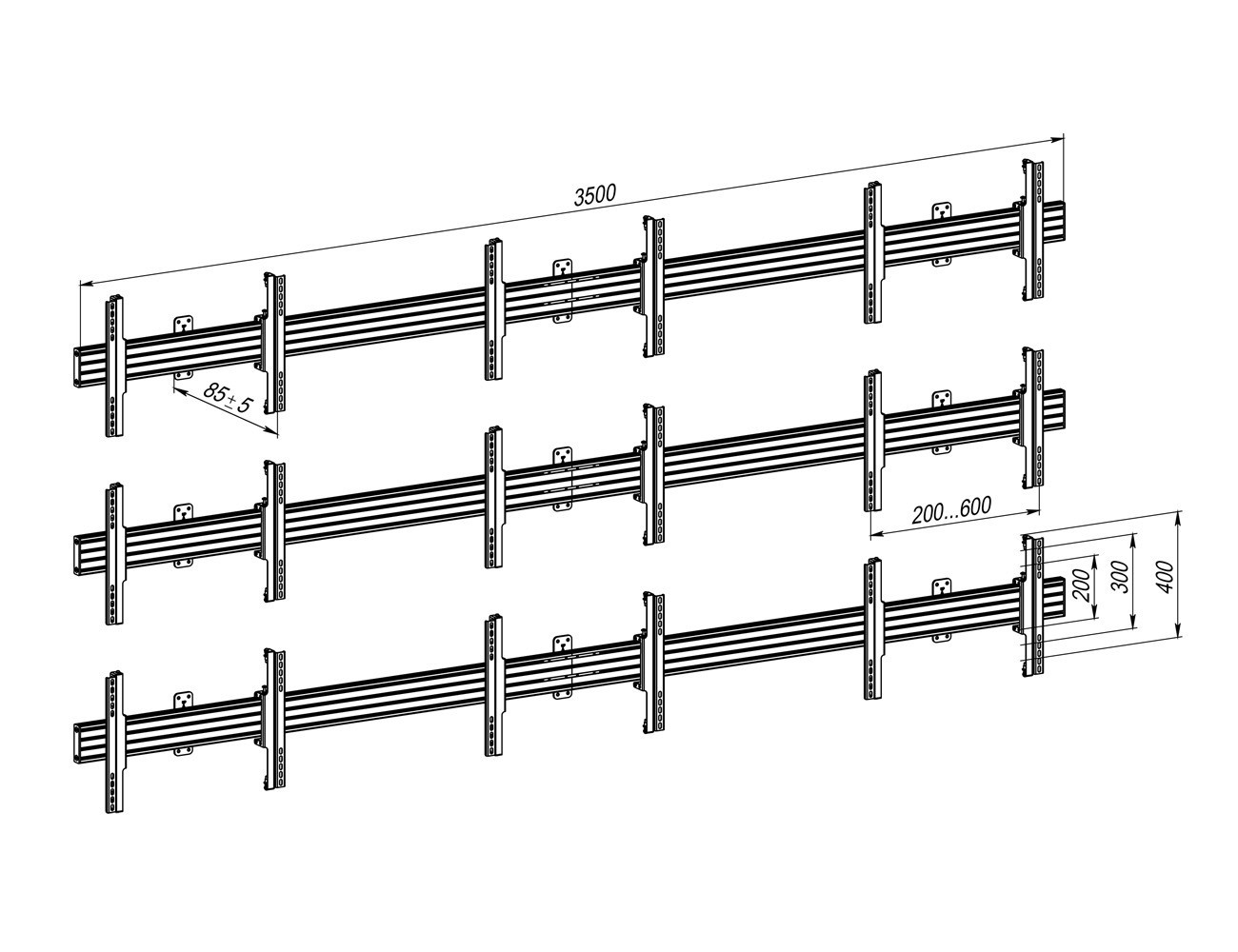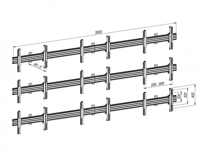 Настінне кріплення KSL VSP6433C призначене для формування відеостіни конфігурації 3×3. Конструкція підтримує дисплеї з діагоналлю 55–60 дюймів і навантаженням до 50 кг на кожен екран. Сумісність із широким діапазоном стандартів VESA спрощує підбір панелей. Рішення орієнтоване на стаціонарне встановлення в комерційних та публічних просторах.