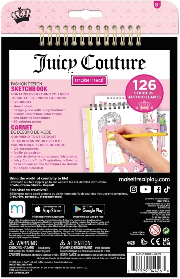 The Make It Real Juicy Couture Fashion Sketchbook is designed for creative work in fashion design and illustration. The concept combines a spiral-bound sketchbook, themed stickers, and stencils styled in the Juicy Couture aesthetic. This format supports both structured learning and free experimentation with visual concepts.