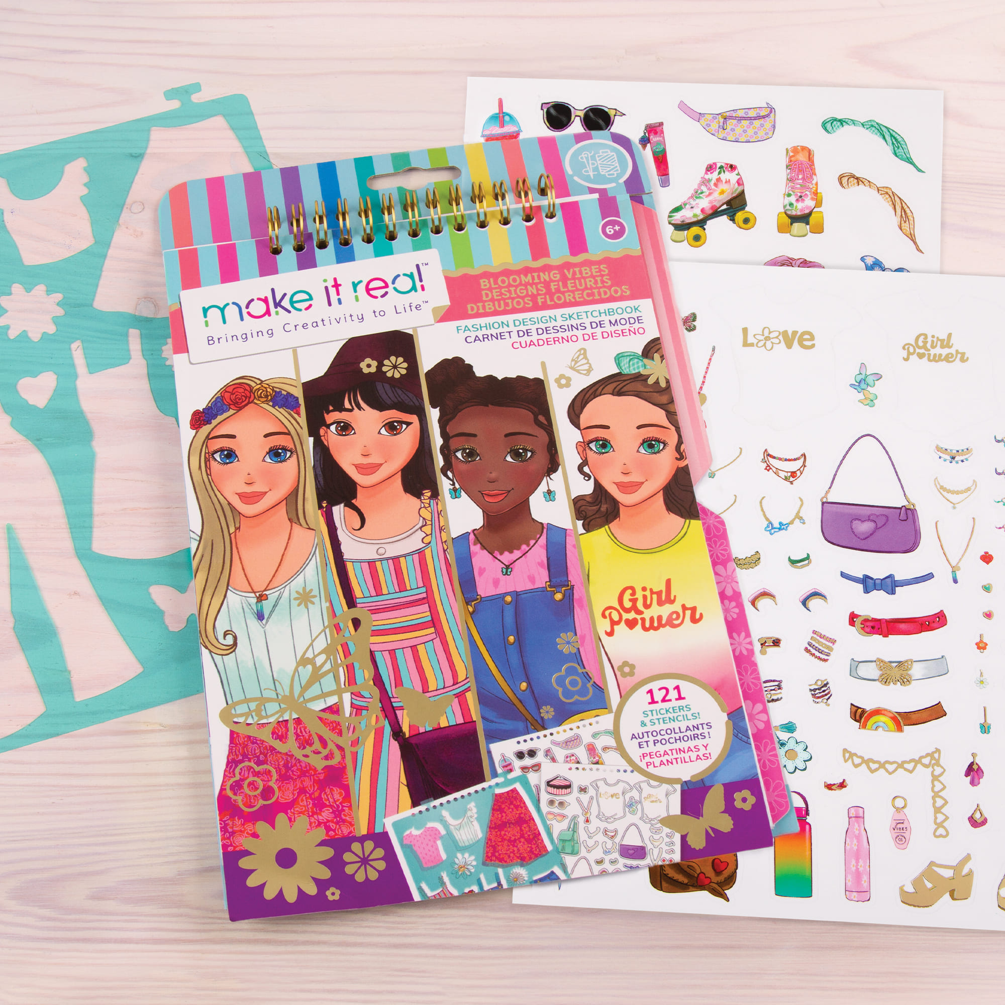 The Make It Real Fashion Design Sketchbook: Blooming Vibes is a structured set for introducing fashion illustration. The kit combines practical pages, stencils, and decorative elements, supporting a clear and organized creative workflow.