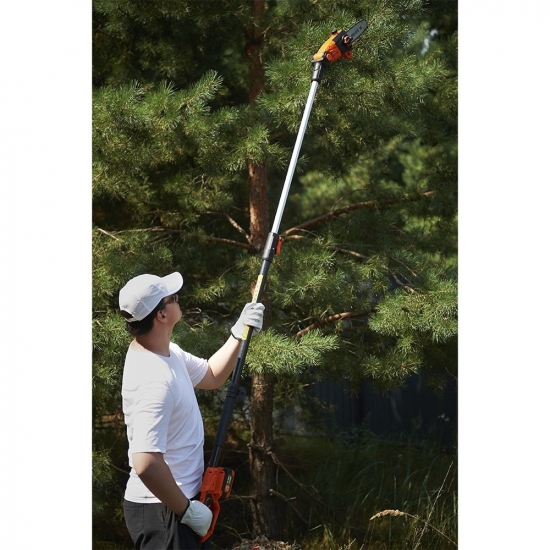 Акумуляторний ланцюговий висоторіз SEQUOIA SBPS2008TO призначений для обрізання гілок і догляду за кроною дерев без використання драбини. Живлення 20 В забезпечує автономну роботу та свободу рухів без кабелю. Телескопічна штанга 186–266 см дозволяє безпечно працювати з високими гілками. Шина Oregon 20 см і швидкість ланцюга 5 м/с формують чистий і контрольований різ. Вага 3,6 кг підходить для тривалішої роботи та зручного транспортування.