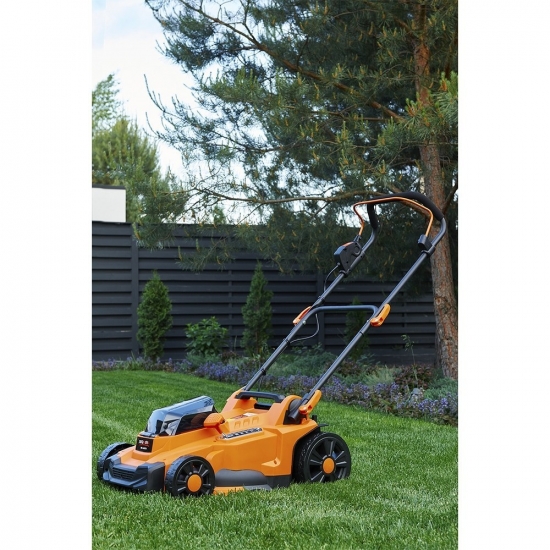 Тип: газонокосарка; Тип двигуна: безщітковий; Ширина охоплення: 37 см; Вага: 11.65 кг; Колір: помаранчевий з чорним