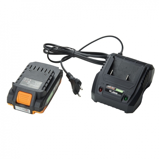 Акумуляторна система Li-Ion напругою 20 В і ємністю 2 А·год забезпечує автономність та мобільність під час роботи. Інструмент не потребує підключення до електромережі, що зручно для використання на відкритих ділянках.