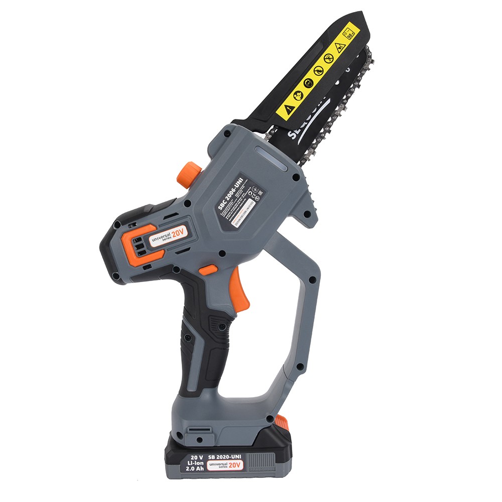 Модель SBC2006-UNI вирізняється продуманою комплектацією – акумулятор 2.0 А·год входить до набору, тому інструмент готовий до роботи одразу після покупки. Компактна 15-сантиметрова шина з ланцюгом 1/4" оптимально підходить для обрізки та формування крони, заготівлі невеликих гілок. Швидкість ланцюга 6.5 м/с забезпечує ефективне розпилювання без зайвих зусиль та чіткі рівні зрізи. Невелика вага 2.05 кг робить пилу надзвичайно зручною для робіт, де важлива мобільність – на драбині, в щільних насадженнях або під час тривалих сесій обрізки. Акумуляторна система виключає необхідність у подовжувачах та дає повну свободу пересування по ділянці.