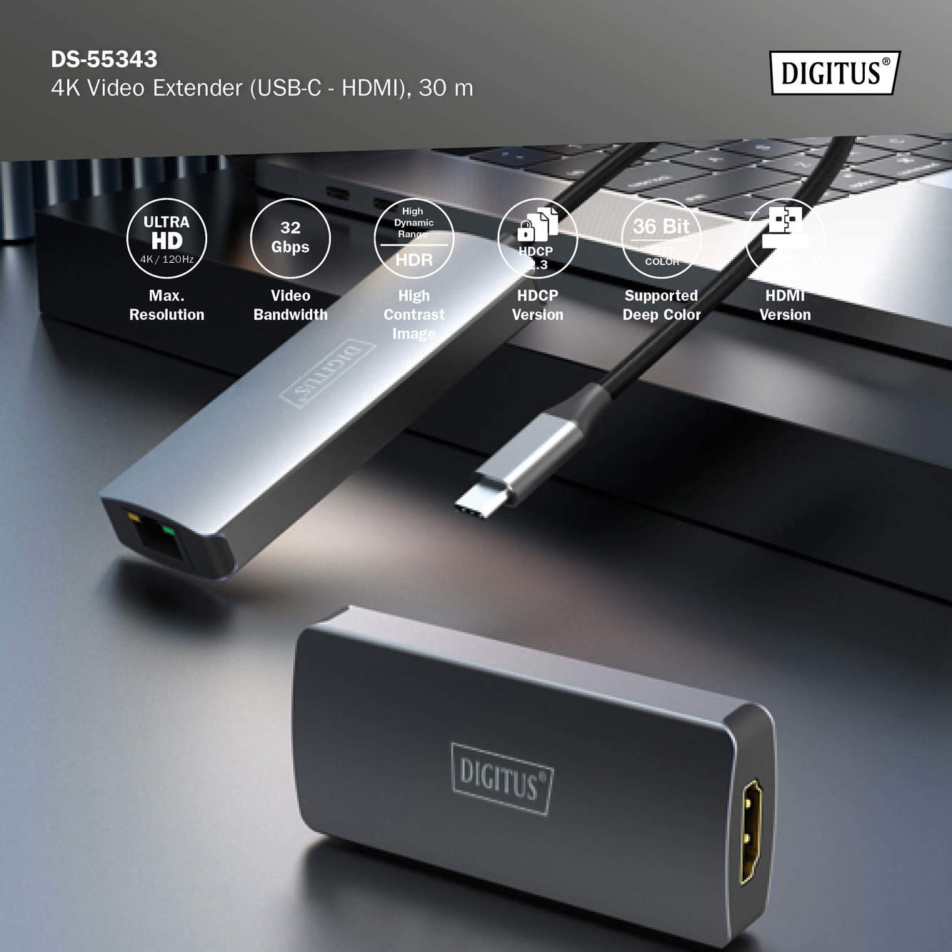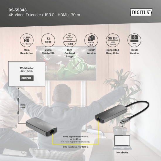 DIGITUS DS-55343 забезпечує стабільну передачу 4K/120 Гц на 30 м без помітних затримок і втрат якості. Рішення підходить для ситуацій, де потрібна висока частота оновлення та HDR на значній відстані від джерела сигналу.