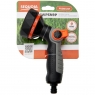 Ергономічна рукоятка з м’яким гумовим покриттям SoftGrip не ковзає навіть мокрою рукою, курок має плавний хід і вбудований фіксатор — можна поливати довго без навантаження на палець. Вага лише 0,3 кг робить цей зрошувач одним з найзручніших для тривалої роботи. Стандартна різьба ¾" сумісна з усіма садовими шлангами та швидкоз’ємними системами. Виріб витримує падіння з невеликої висоти та легкі морози (при зливі води).