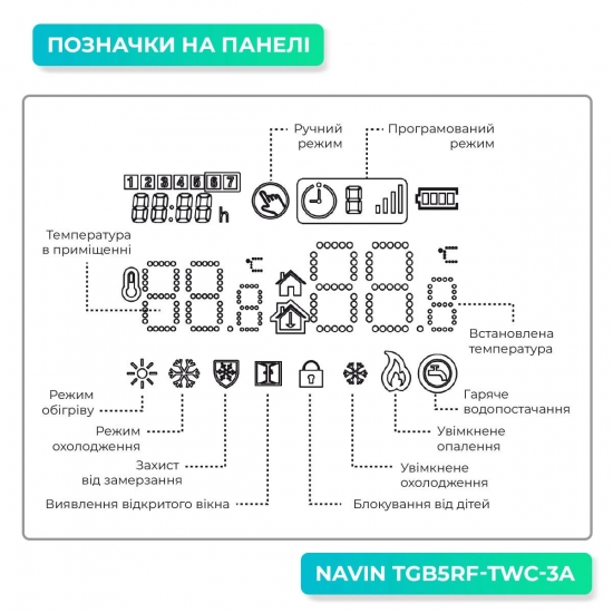 Терморегулятор Navin TGB5RF-3A поєднує свободу розміщення панелі, стабільне радіоз’єднання з котлом та сучасне Wi-Fi-керування, створюючи зручну систему регулювання опалення, адаптовану до реальних потреб будинку чи квартири.