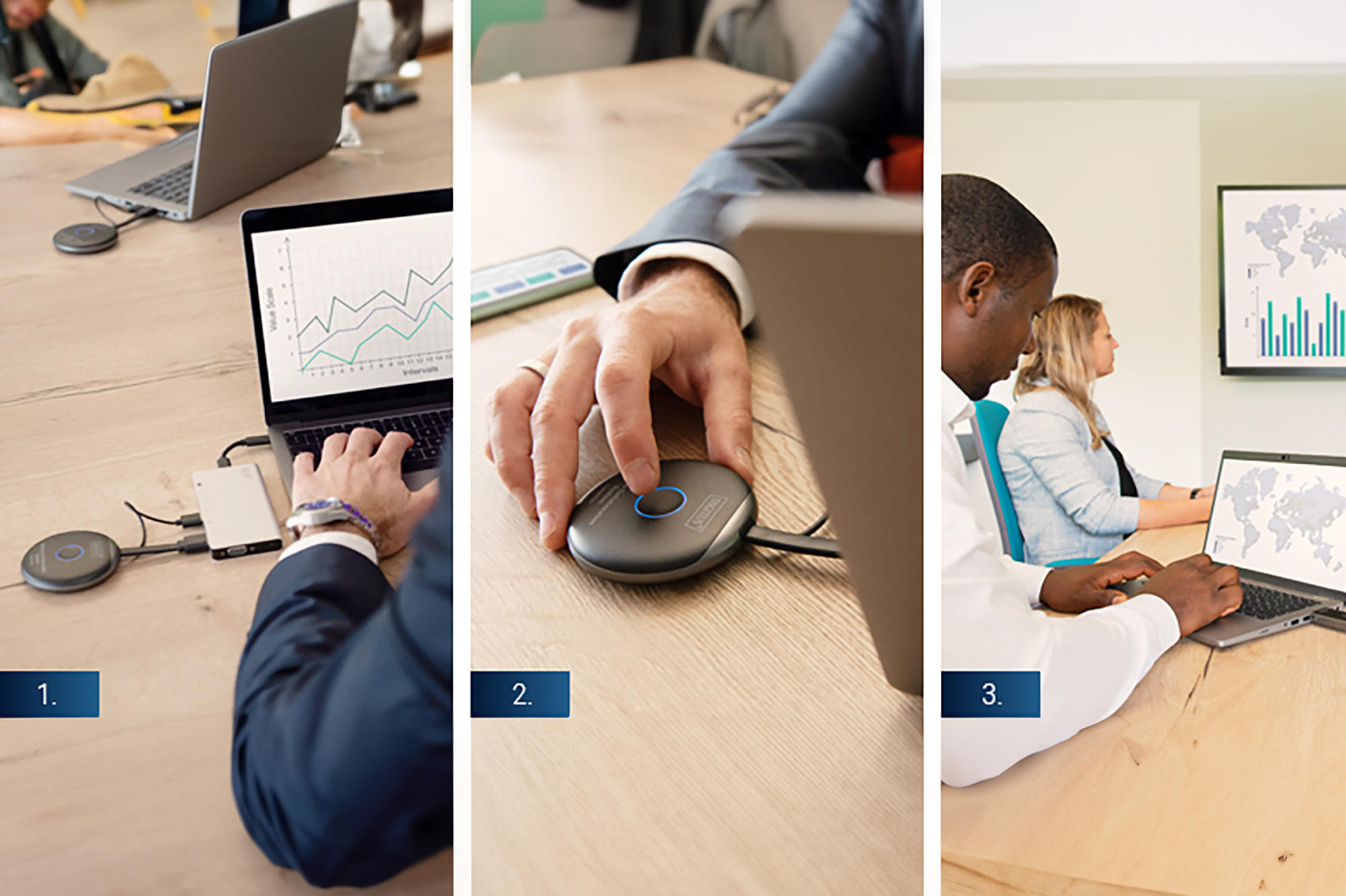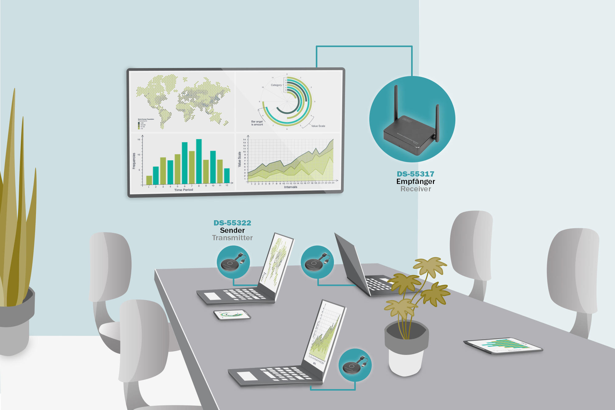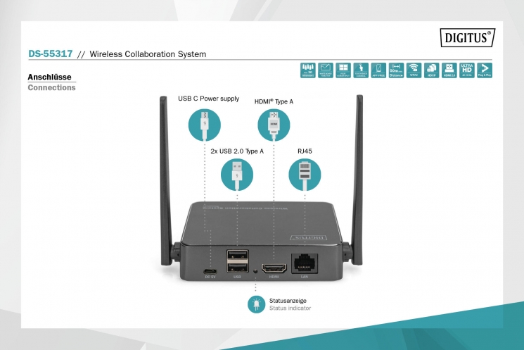 Система DIGITUS Click & Present Pro забезпечує бездротову передачу контенту з ноутбуків, планшетів і смартфонів на спільний екран у конференц-залах. До приймача підключаються до 30 пристроїв, з можливістю одночасної презентації від чотирьох учасників на розділеному екрані. Конфігурація спрощена без потреби в додатковому програмному забезпеченні, а відстань передачі сягає 50 метрів за умови прямого огляду.