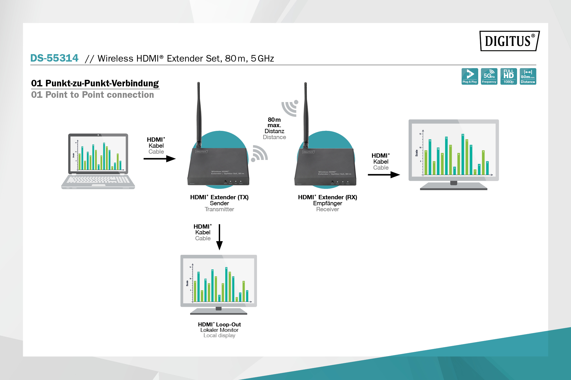 HDMI Extender Set — це потужна система розподілу відео, яка складається з одного передавача/приймача. Він розширює сигнали Full HD AV за допомогою мережевого кабелю CAT6 (з’єднання «точка-точка») до 120 м. Крім того, використовуючи мережеві комутатори та окремі блоки приймача (DS-55518), ви можете поширювати свій відеоконтент до 253 дисплеїв через уже існуючу мережу (IP-з’єднання) і розширювати їх на необмежену відстань. Додатковий інтегрований односпрямований ІЧ-інтерфейс дозволяє дистанційно керувати джерелом вхідного сигналу з вихідного екрана (сторона приймача).