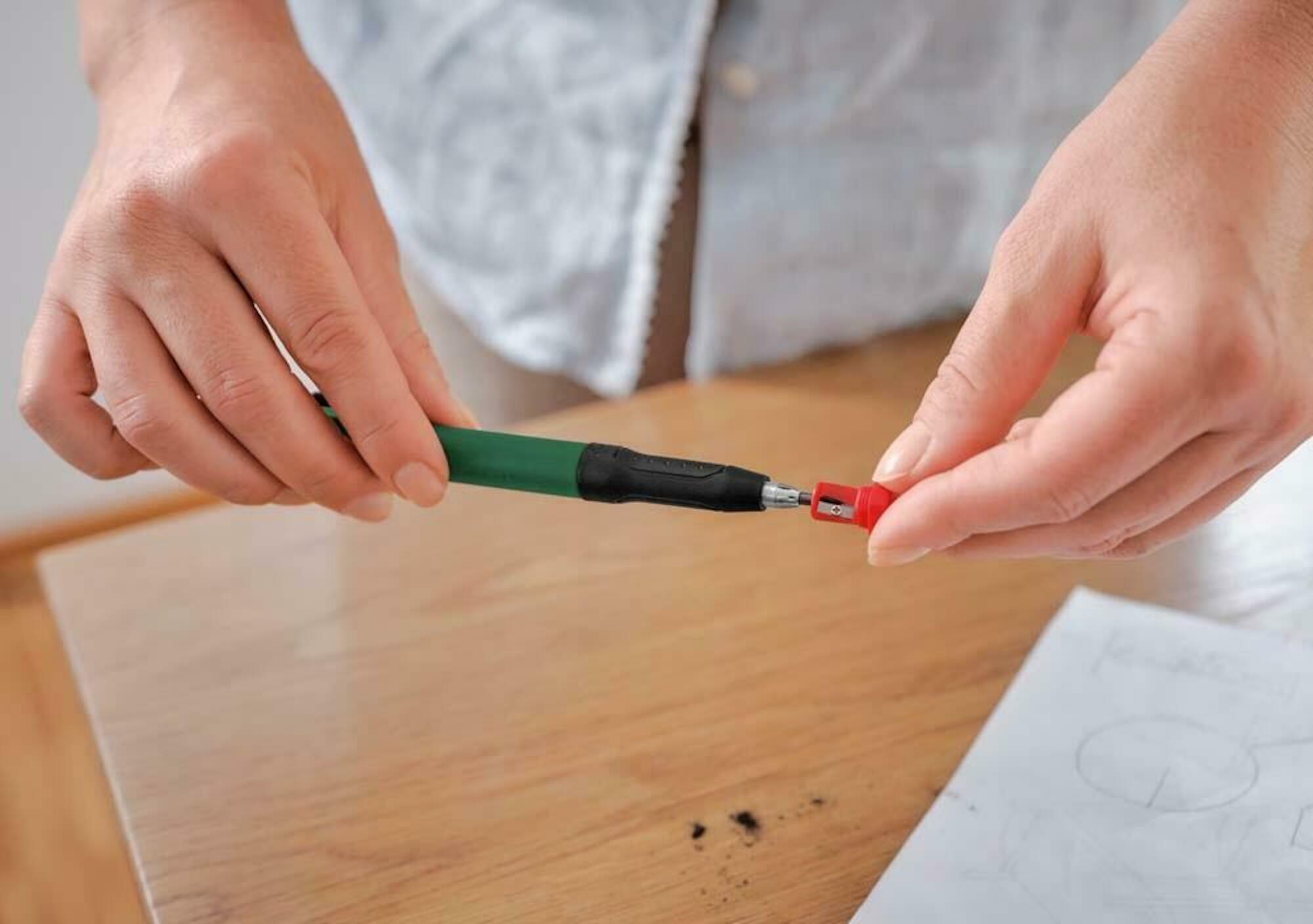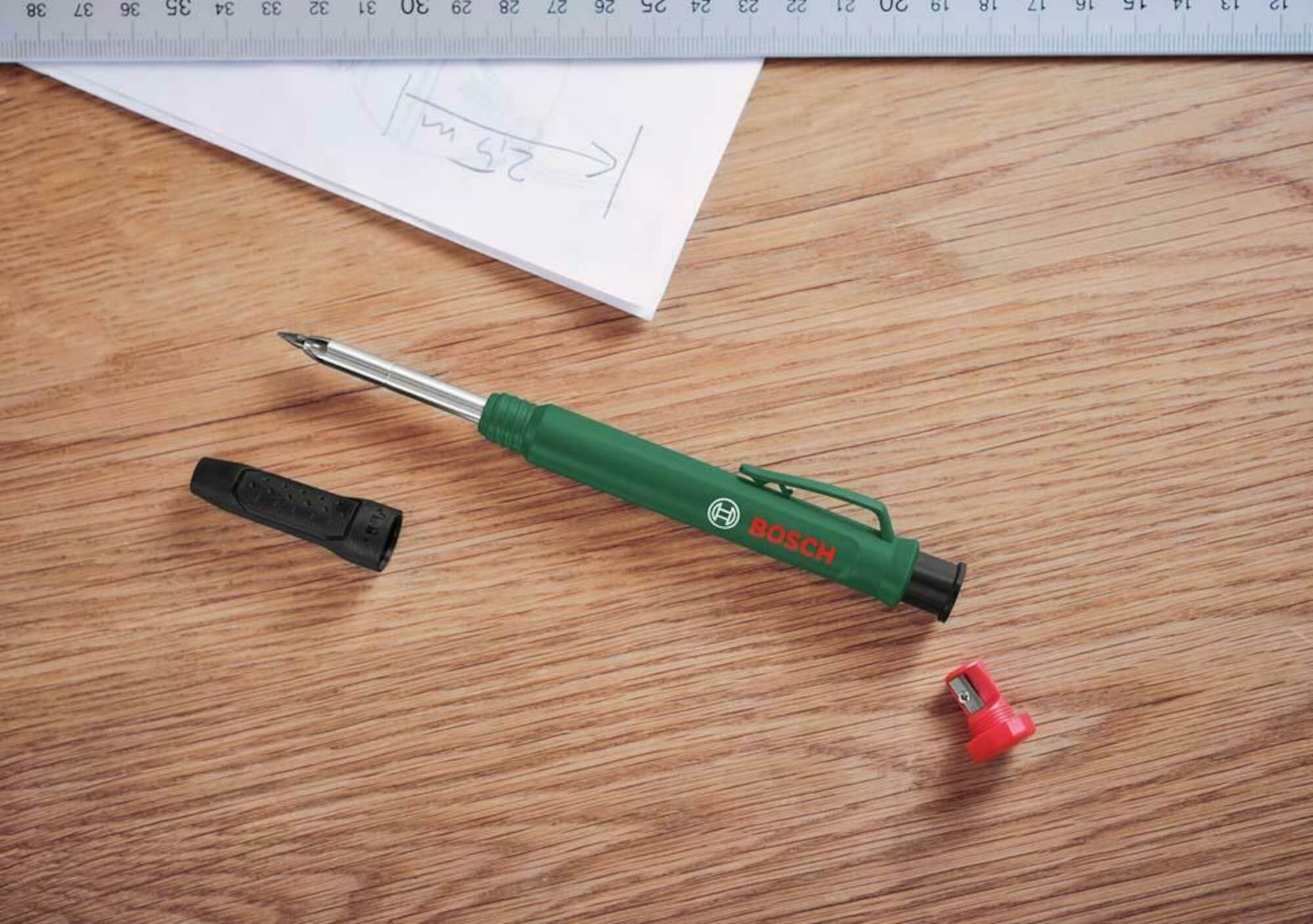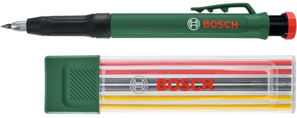 Ентузіасти домашнього ремонту оцінять високу якість, гнучкість і ефективність олівця для глибоких отворів від Bosch. Має знімний ковпачок, тому, знявши його, можна не тільки легко наносити розмітку на плоскі поверхні, але й легко проникати в глибокі отвори для гнучкого маркування. Завдяки високоякісному графітовому стрижню олівець можна використовувати для маркування на різноманітних матеріалах, включаючи камінь, бетон, цеглу, дерево та папір. Завдяки вбудованій точилці олівець завжди гострий і готовий до використання.