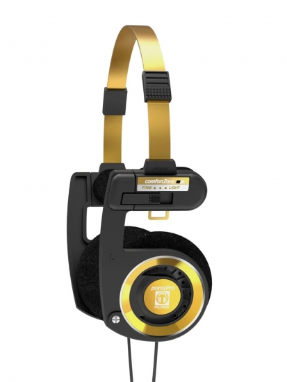 Koss Porta Pro Classic Black Gold — накладні навушники відкритого типу з підключенням через 3.5 мм mini-jack. Складна конструкція та невелика вага спрощують транспортування й щоденне використання. Динамічні драйвери 40 мм відтворюють частоти в діапазоні 15–25 000 Гц при опорі 60 Ом і чутливості 101 дБ. Регульована система Comfort Zone зменшує тиск на вуха під час прослуховування.